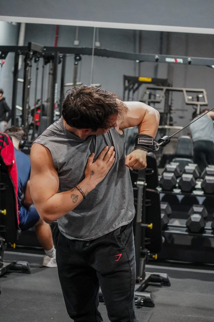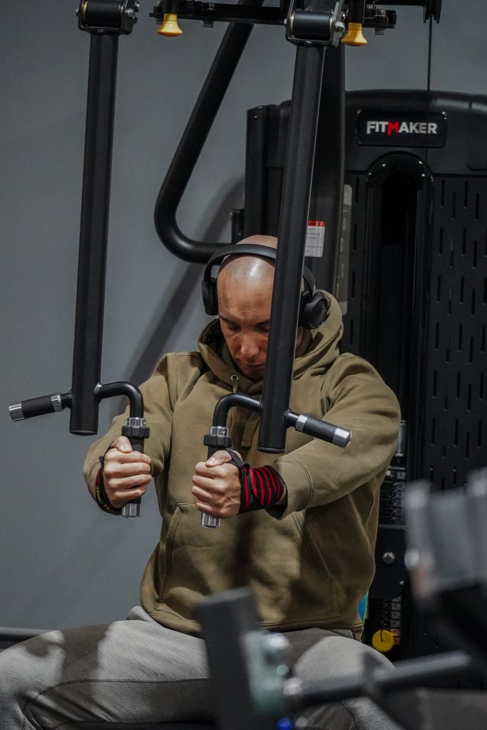 Máquinas, poleas, banco, mancuernas y accesorios.